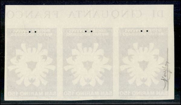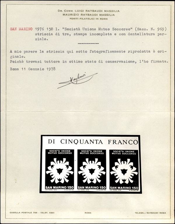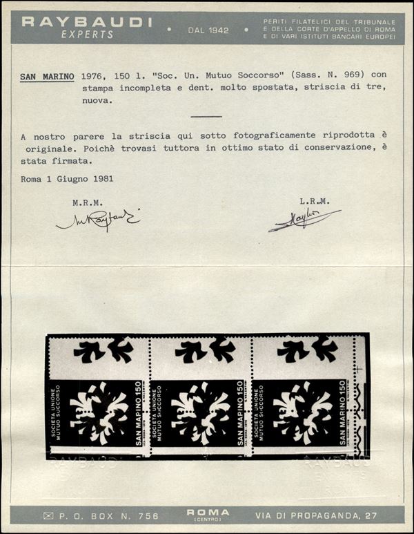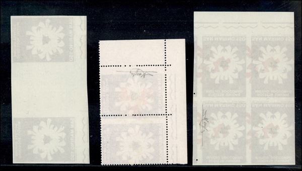 1976 - 150 lire Mutuo Soccorso (969) - Errori di Stampa e Dentellatura - quartina + 2 coppie + 2 strisce di tre - tutte varietà diverse - splendido insieme - gomma integra - cert Raybaudi