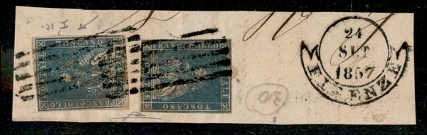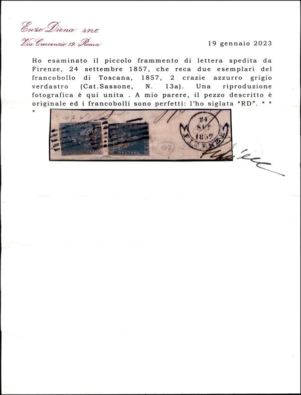 2 crazie azzurro grigio verdastro (13a) su frammento - Firenze 24.9.57 - cert. R. Diena