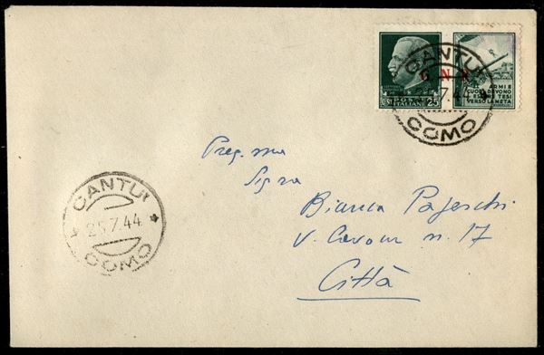 25 cent Esercito (14/IIIee) con punto piccolo dopo N - isolato su busta per cittą - Cantł 25.7.44