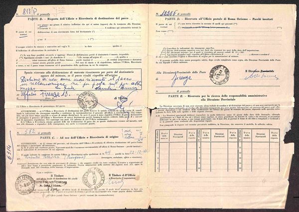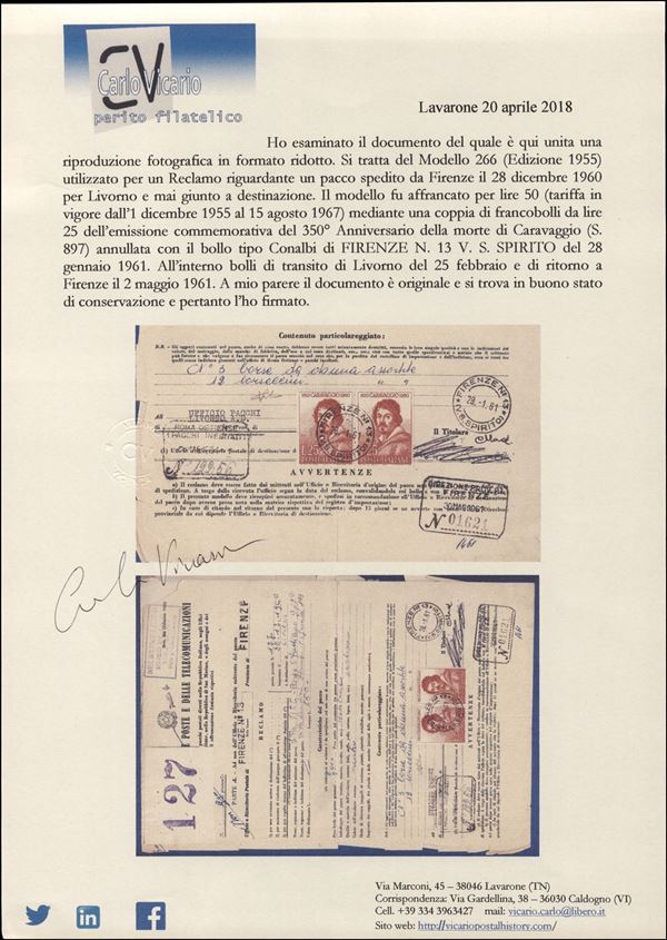 25 lire Caravaggio (897) - coppia su Reclamo Pacchi (Mod. 266) da Firenze a Roma del 28.1.61