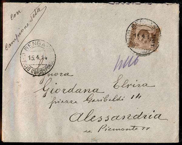 40 cent (8) - busta "con campione di seta" da Bengasi a Alessandria del 15.4.1914