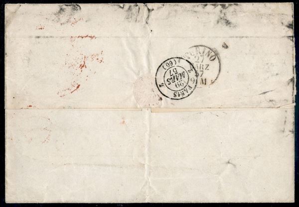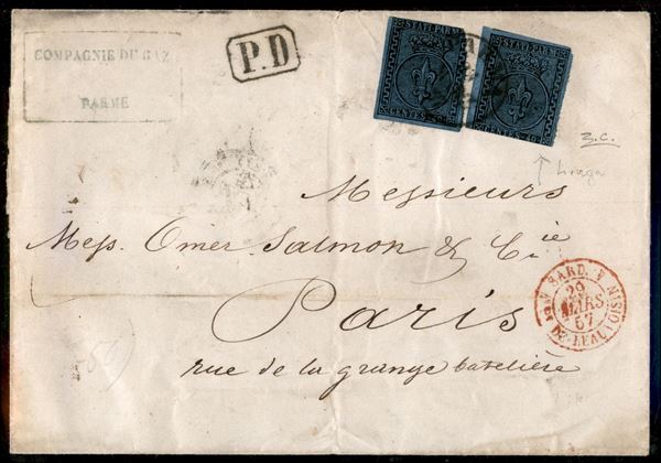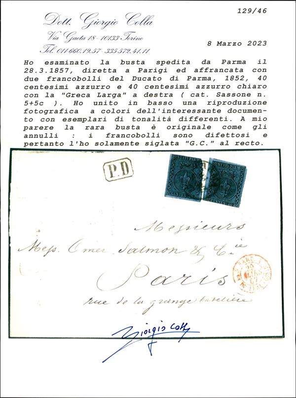 40 cent azzurro chiaro (5c) con Greca Larga a destra + 40 cent azzurro (5) su busta spedita da Parma a Parigi del 28.3.57 - interessante e raro documento malgrado i francobolli difettosi - cert. Colla