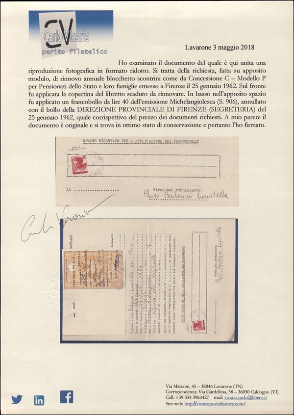 40 lire Michelangiolesca (906) su modulo per richiesta rinnovo concessioni - Firenze 5.1.62