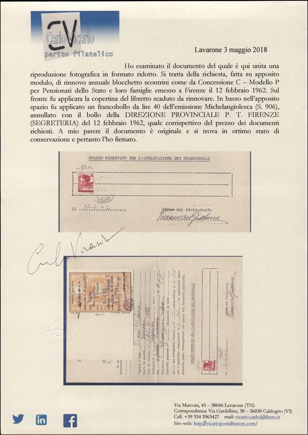 40 lire Michelangiolesca (906) su modulo per richiesta rinnovo concessioni - Firenze 12.2.62
