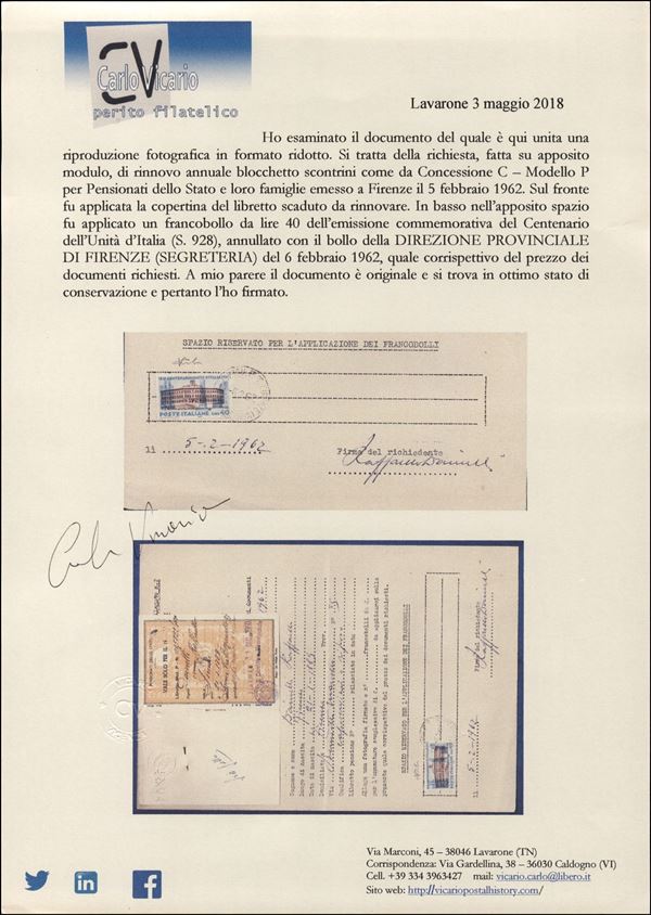 40 lire Unità d'Italia (928) su modulo per richiesta rinnovo concessioni - Firenze 6.2.62