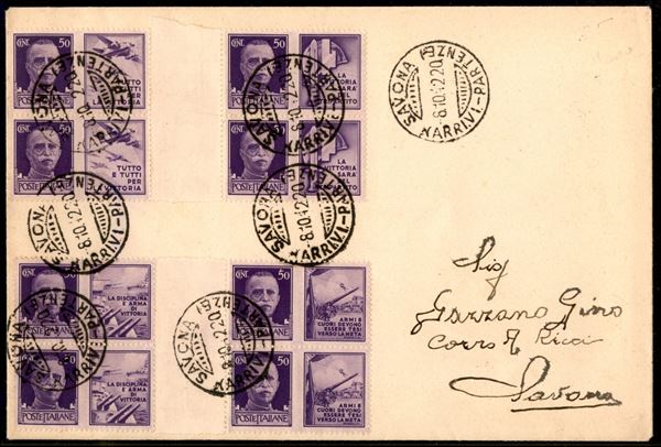 50 cent (9/12) - 4 valori in quartine (9/10 + 11/12) con interspazi al centro - busta per cittą - Savona 8.10.42
