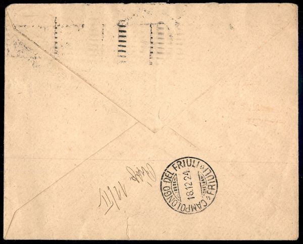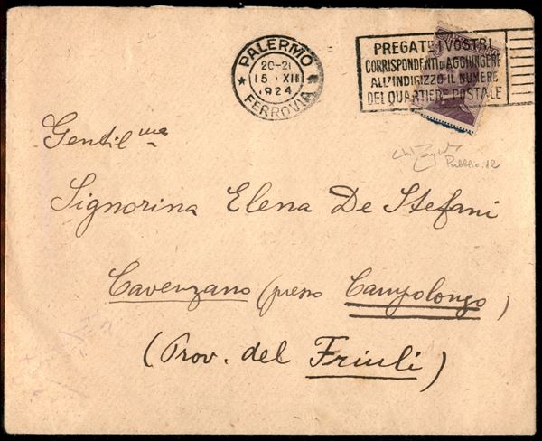 50 cent De Montel (12) privato dell'appendice pubblicitaria - busta da Palermo a Cavenzano del 15.12.1924