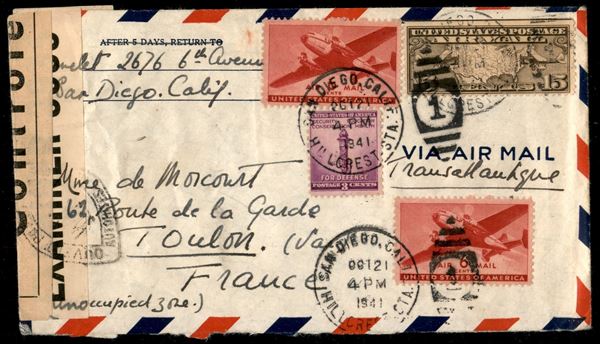Aerogramma da San Diego Calif. a Tolone del 4.11.1941 con affrancatura multipla (301 + 497 + 500 + 500)