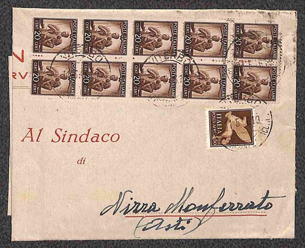 Blocco di dieci del 20 cent Democratica (544) + 50 cent Pegaso (11 - Aerea) su piego da Viterbo a Asti del 1.5.1946