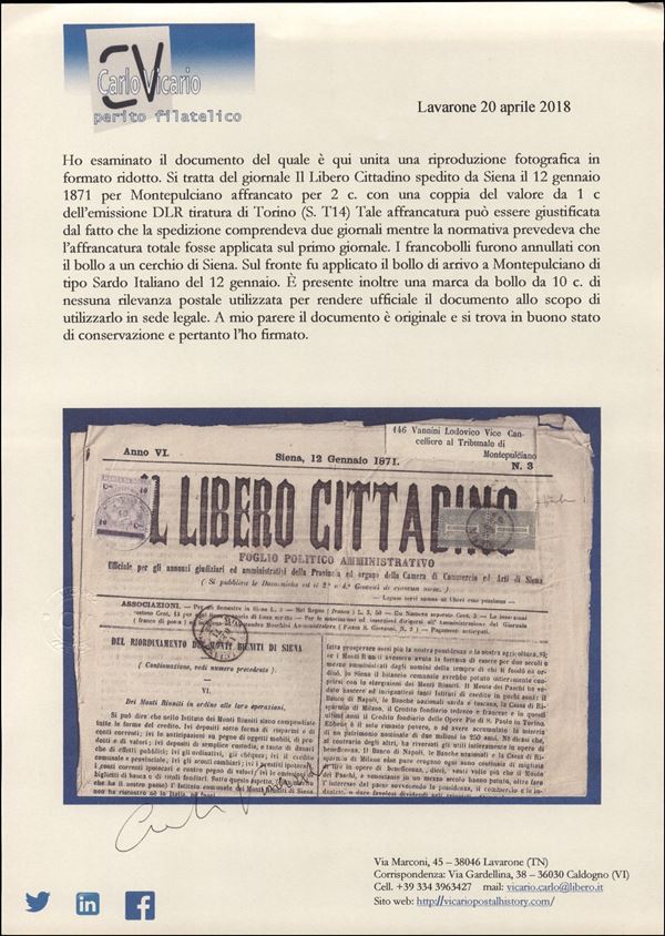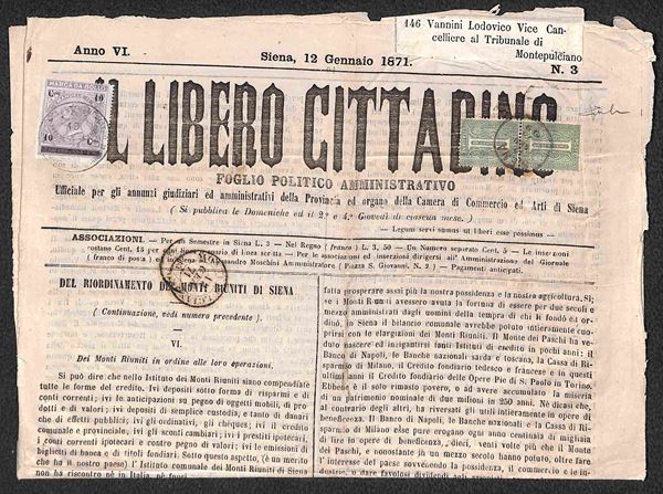 Coppia del 1 cent Torino (T14) + Marca da bollo da 10 cent - giornale da Siena a Montepulciano del 12.1.71