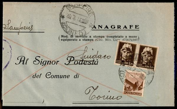 Coppia del 1,20 lire Turrita (532) + 10 cent Democratica (543) su piego da Sampeire a Torino del 18.3.1946