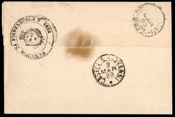 Coppia del 2 cent (15) + 5 cent (37) + 1 cent (14) in uso misto tricolore - piego da Firenzuola d'Arda a Castel S. Giovanni del 3.3.1889