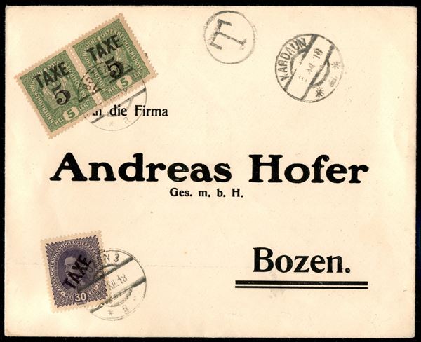Due valori (41 + 66 coppia) su busta da Kardaun a Bolzano del 3.12.18 tassata in arrivo