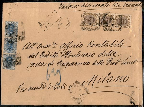 Frontespizio di assicurata lire trecento 17 porti affrancata con striscia di tre 1 lira + striscia di tre 25 cent (48 + 62) - da Mantova per Milano del 4.2.90