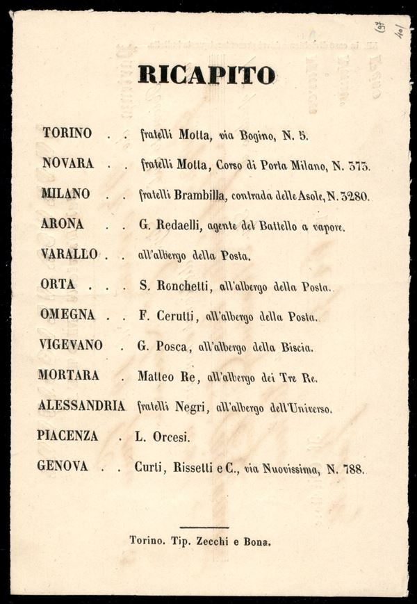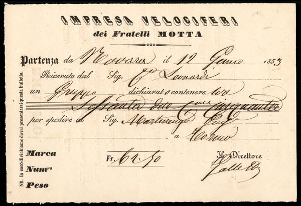 Impresa Velociferi (dei Fratelli Motta) - ricevuta per gruppo di lire 62,50 da Novara a Torino del 12.1.53 - autografo Galletti