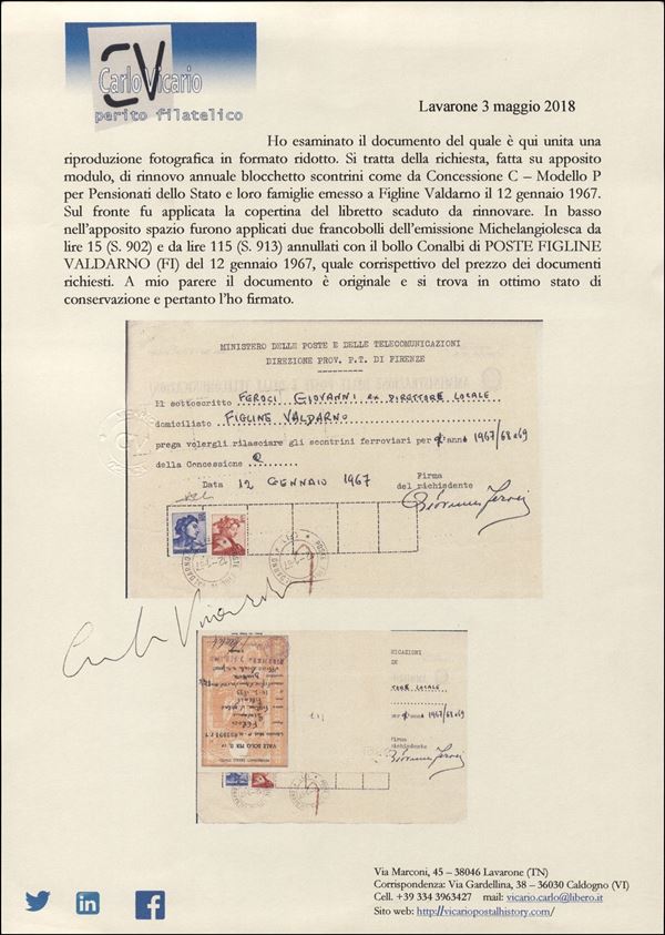 Michelangiolesca (902+913) - 2 valori usati su modulo per richiesta rinnovo concessioni - Figline Valdarno 12.1.67