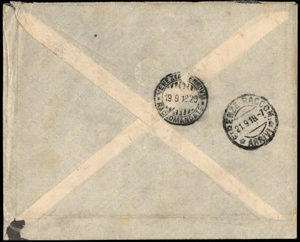 Prestito Nazionale 1917 - 50 cent Michetti (Unificato 1 - varietà) - coppia con soprastampe oblique spostate al centro (senza 1917 e parziali a destra) - raccomandata da Venezia a Firenze del 19.9.18