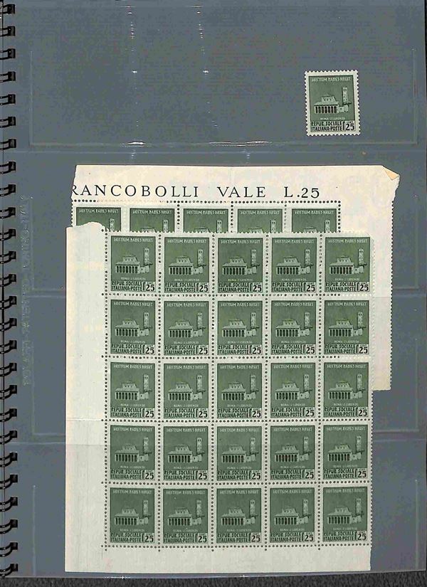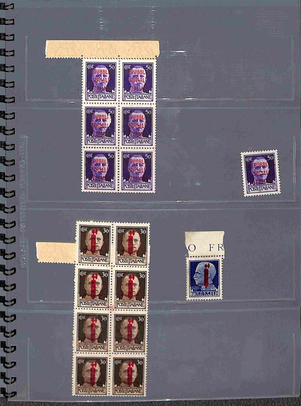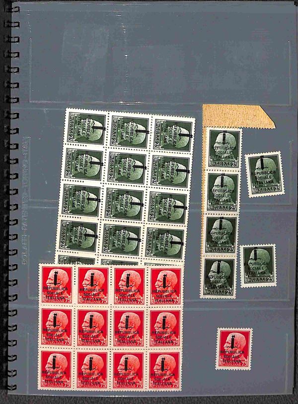 REPUBBLICA SOCIALE - 1944/1945 - Insieme di valori singoli e in blocchi nuovi di Fascetti e Monumenti Distrutti in un piccolo album - completa il lotto una quindicina di Interi Postali di Regno