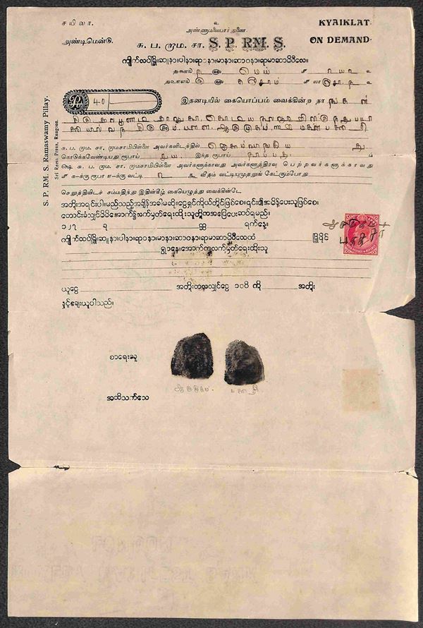 Ricevuta affrancata con 1 anna - Kyaiklat on Demand - S.P.RM.S. Ramaswamy Pillay