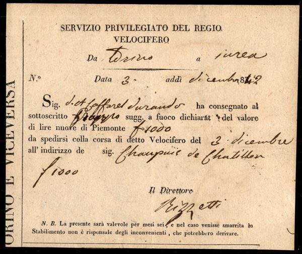 Servizio Privilegiato del Regio Velocifero (da Torino a Ivrea del 3.12.42) - ricevuta autografa Rizzetti