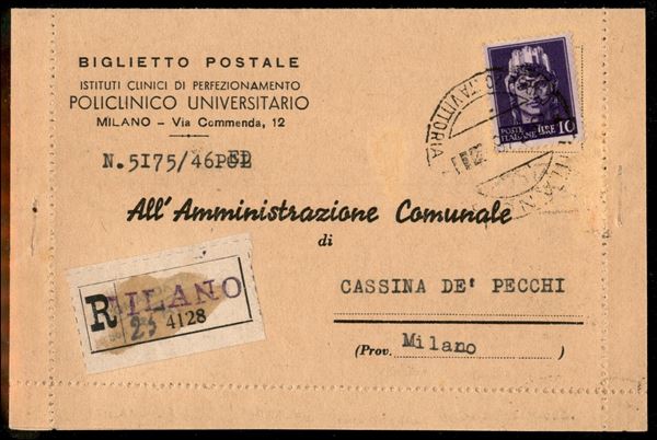 10 lire Turrita (542) isolato su busta raccomandata da Milano a Cassina Pecchi del 23.3.46