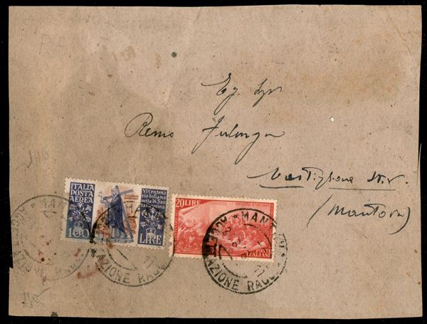 100 lire S. Caterina (146) + 20 lire Risorgimento (588) - etichetta di pacco da Mantova a Castiglione del 24.8.48