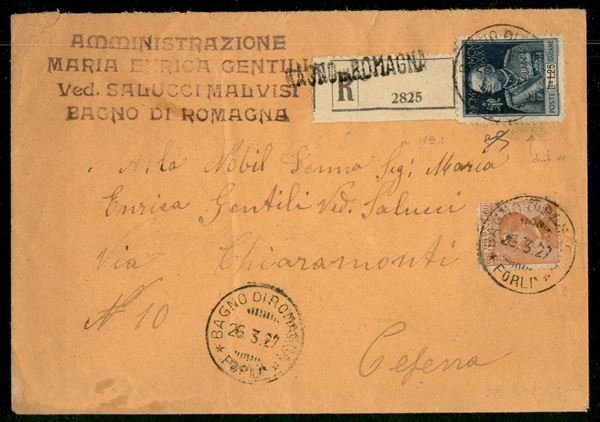 1,25 lire Giubileo (191) dentellato 11 + complementare (205) su raccomandata da Bagno di Romagna a Cesena del 26.3.27 - Biondi