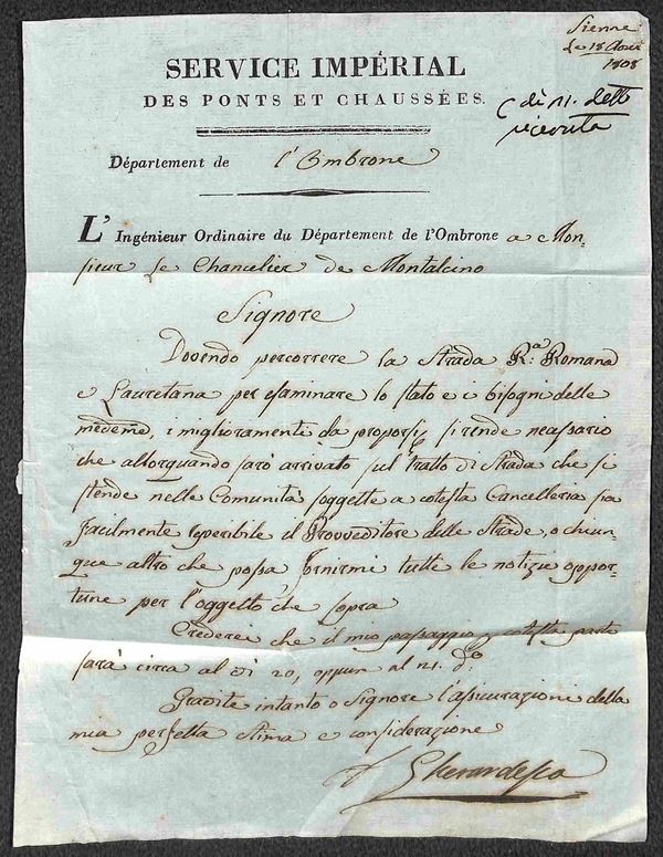 1808 (18 agosto) - siena - Service Imperial des Ponts et Chausses - lettera autografa Gherardesca per Montepulciano