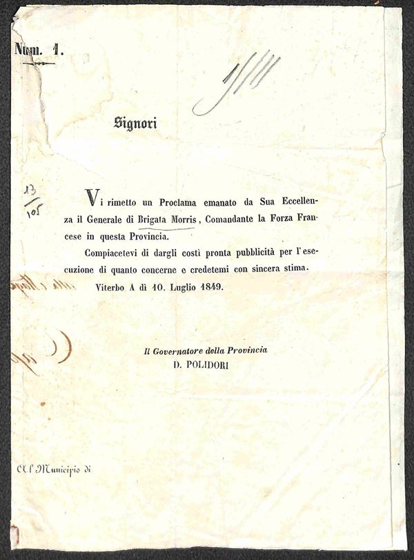 1849 (10 luglio) - Viterbo - circolare accompagnatoria del Proclama del Generale Morris
