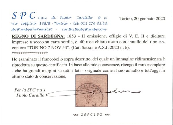 1853 - 40 cent rosa chiaro (6) usato - Torino 7.11.53 - grandi margini - cert. Cardillo