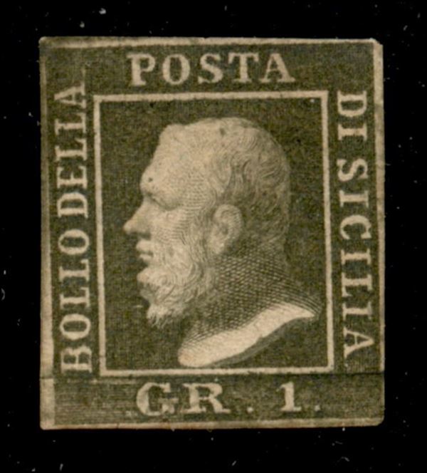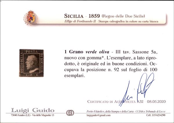 1859 - 1 grano verde oliva (5a) III Tavola (Pos. 92) - gomma originale con traccia di linguella - esemplare con due buoni margini e preciso in alto e a destra - Diena + cert. Guido