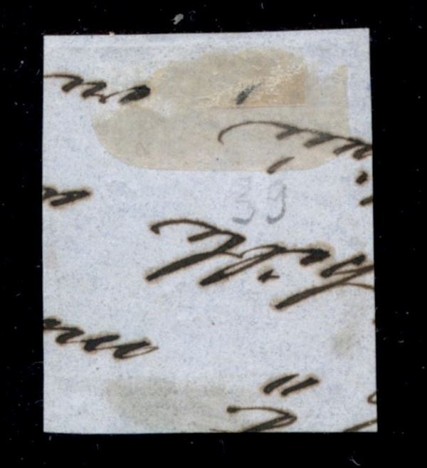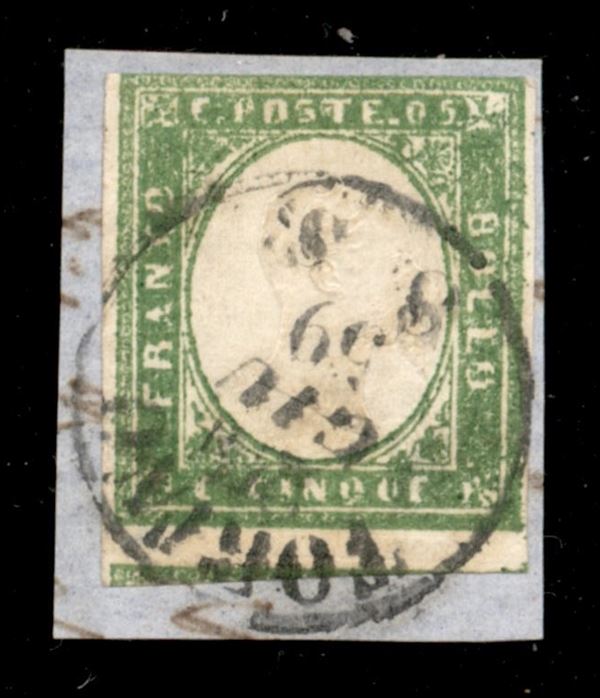 1859 - 5 cent (13Be - stampa difettosa) usato su frammento a Torino - disegno a filo in alto