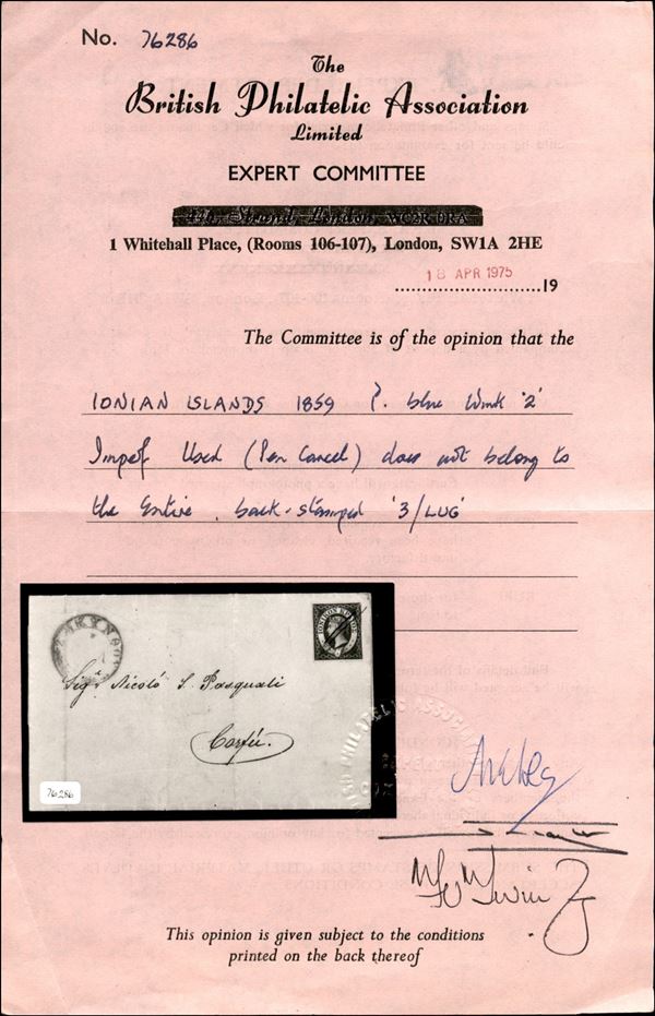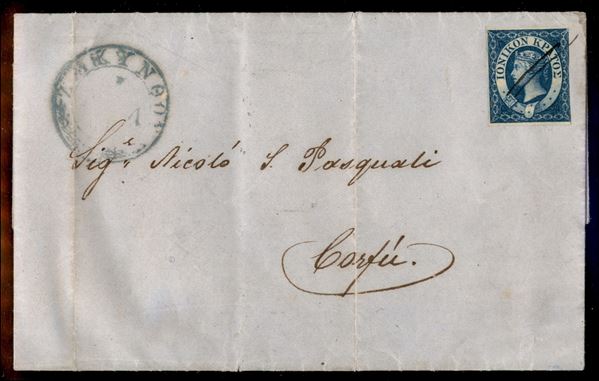 1859 - Isole Jonie - 1 penny (2) su busta da Zakintos a Corfù - al retro 3 Lug - cert. B.P.A.