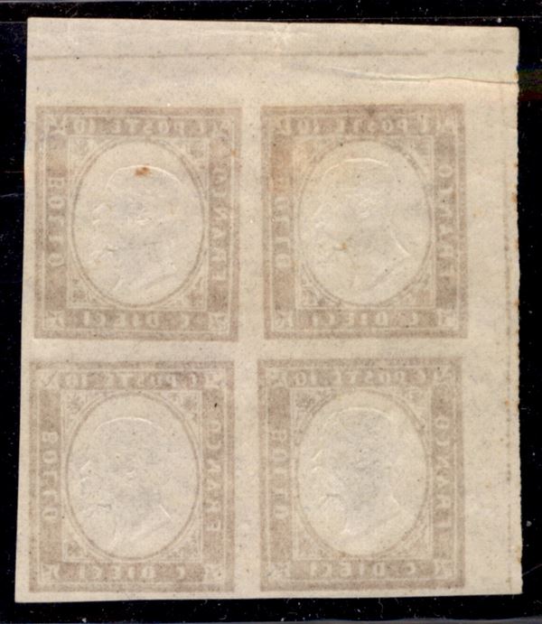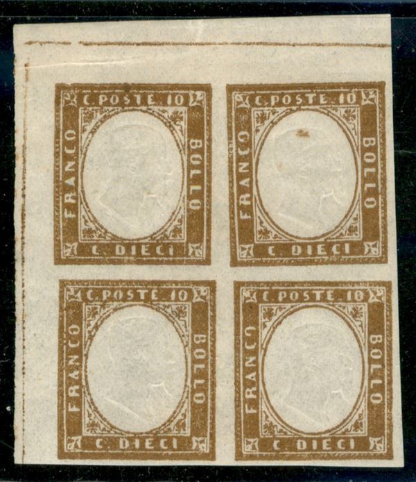 1863 - Resti di Stampa - 10 cent (14E) - blocco angolare sinistro di 4 con linea di riquadro completa su due lati - probabili effigi postume - gomma originale - da esaminare