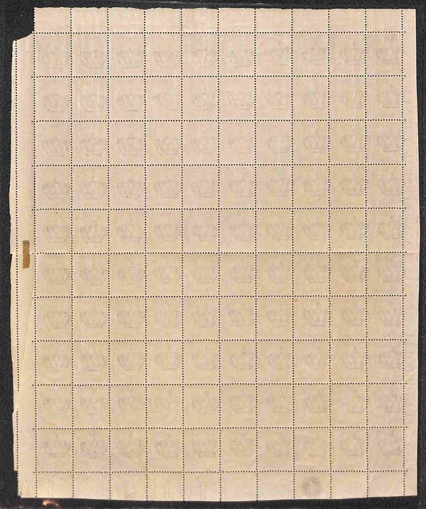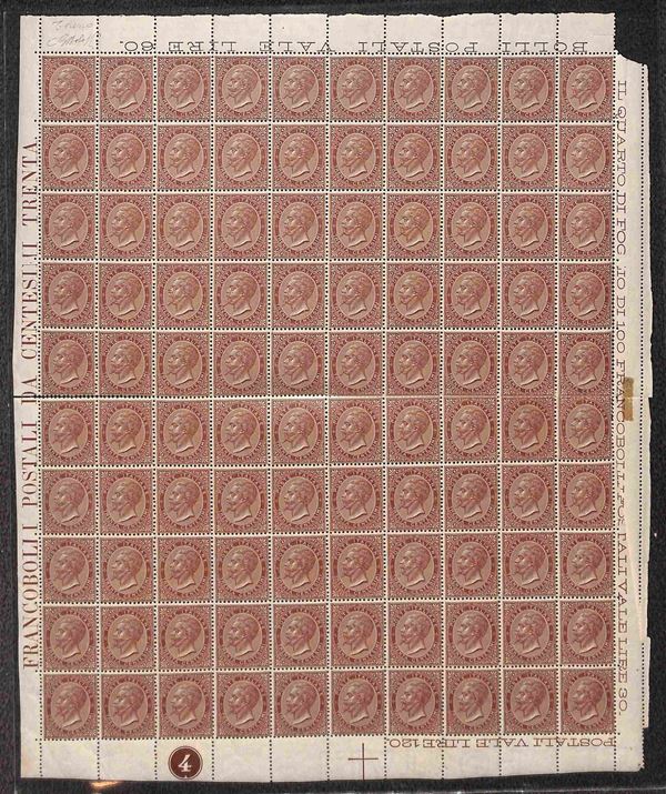 1863 - Torino - 30 cent (19) - intero foglio di 100 bordo foglio da ogni lato con numero di Tavola (4) in basso (quarto inferiore sinistro della composizione) - profondo taglio di forbice diagonale sull'interspazio destro che colpisce la dentellatura della posizione 60 - gomma integra
