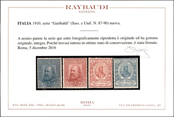 1910 - Garibaldi (87/90) - serie completa - gomma integra - cert. Raybaudi
