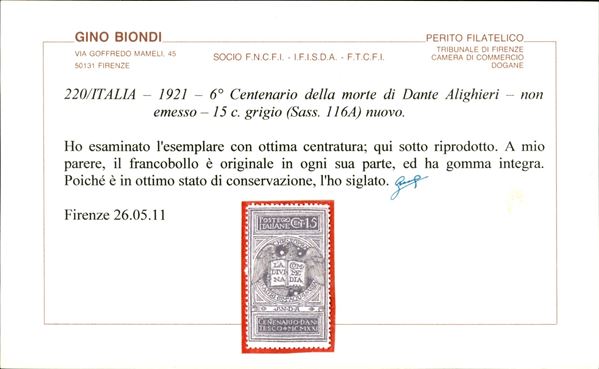 1921 - 15 cent Non Emesso (116A) - ottimamente centrato - gomma integra - cert. Biondi