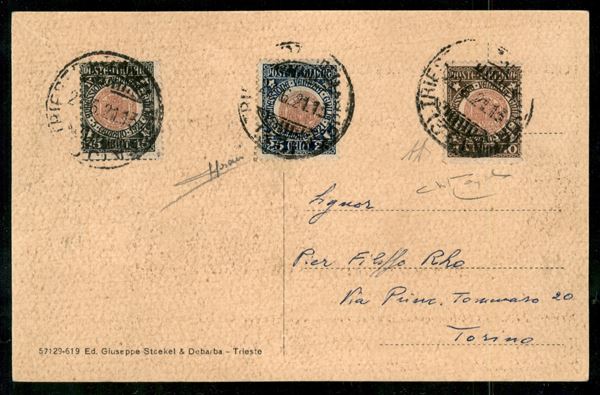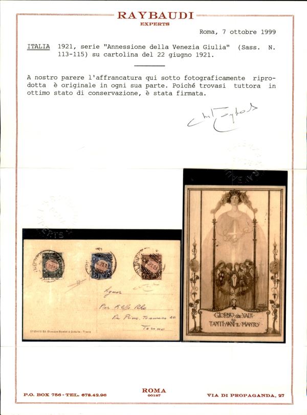 1921 - Annessione Venezia Giulia (113/115) - serie completa su cartolina commemorativa - molto bella - Diena + Sorani + cert. Raybaudi