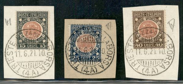 1921 - Annessione Venezia Giulia (113/115) - serie completa su frammenti - Trieste P.zza Borsa 11.6.21 - Biondi
