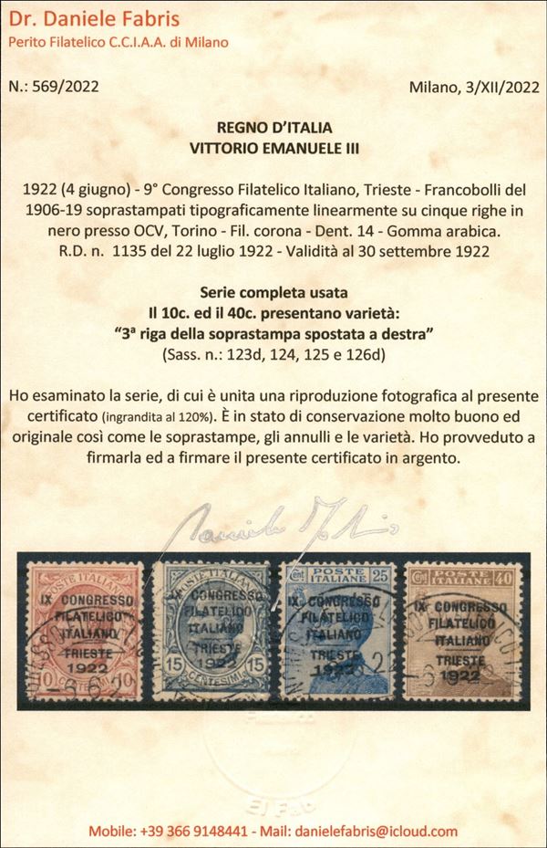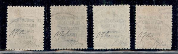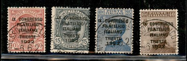 1922 - Congresso Filatelico (123/126) - serie completa usata - varietà "d" per il 10 cent e per il 40 cent - cert. Fabris