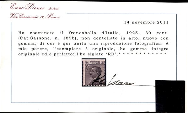 1925 - 30 cent (185b) non dentellato in alto - gomma integra - cert. Diena