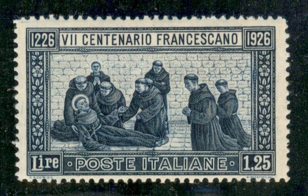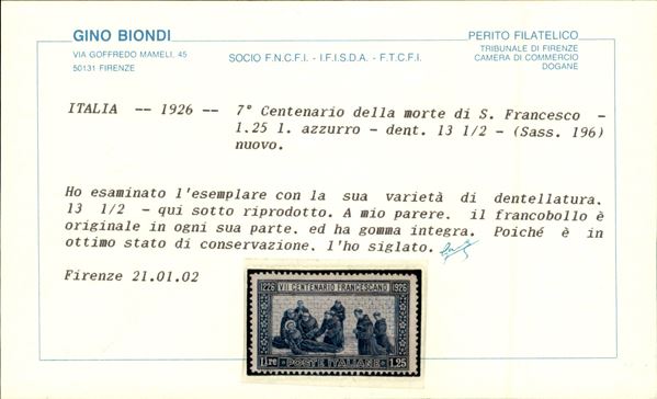 1926 - 1,25 lire S. Francesco (196) dentellato 13 1/2 - gomma integra - cert. Biondi