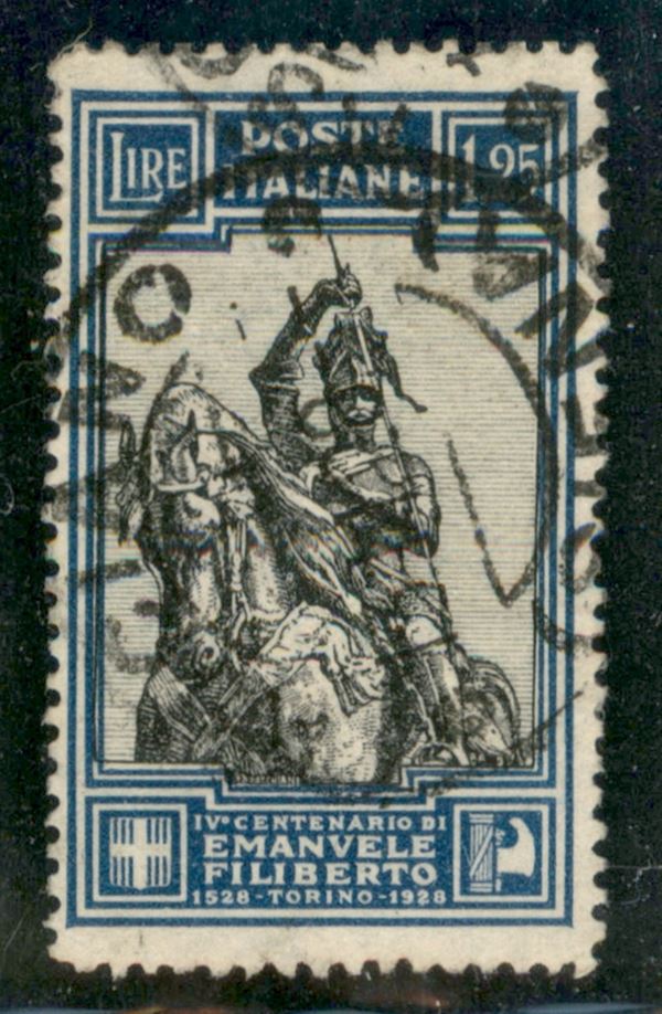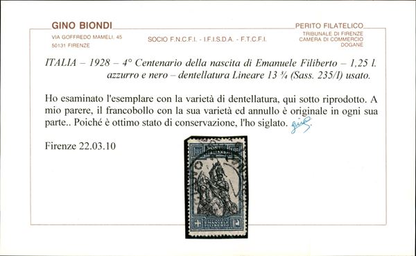 1928 - 1,25 lire Emanuele Filiberto (235/I) dentellato 13 3/4 - usato - cert. Biondi