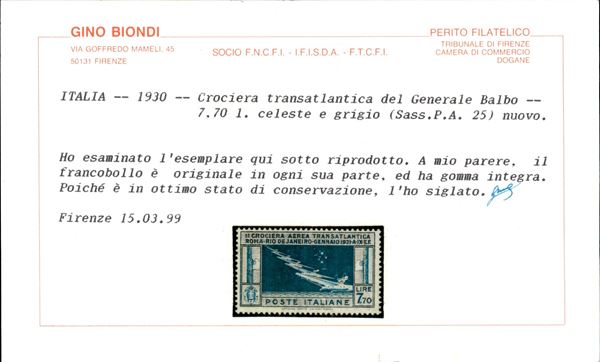 1930 - 7,70 lire Balbo (25) - ben centrato - gomma integra - cert. Biondi