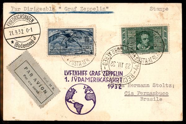 1932 (21 marzo) - Zeppelin - 1° Sudamerikafahrt - cartolina da Milano a Pernambuco