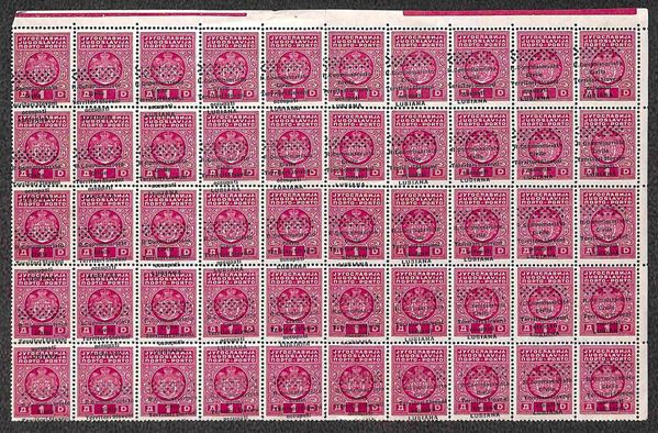 1941 - 1 din Segnatasse (7d) con soprastampe oblique - mezzo foglio di 50 (parte superiore) - gomma integra