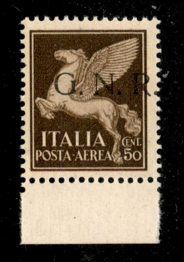 1943 - 50 cent (118/Id - Aerea) con soprastampa spostata - punto a cavallo - bordo foglio - gomma integra