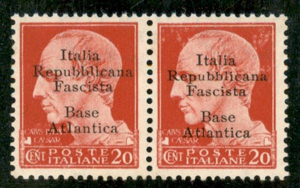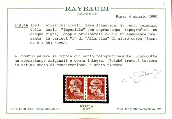 1943 - Coppia del 20 cent (8+8h) con l di corpo diverso - gomma integra - cert Raybaudi