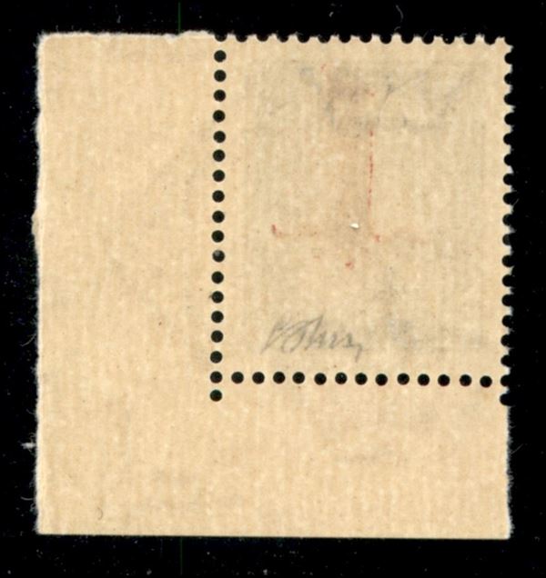 1944 - 25 cent (490) con fascio grosso (posiz. 100) angolo di foglio inferiore destro (da interspazio) - gomma integra - 50 pezzi nella tiratura - G. Oliva + cert. AG