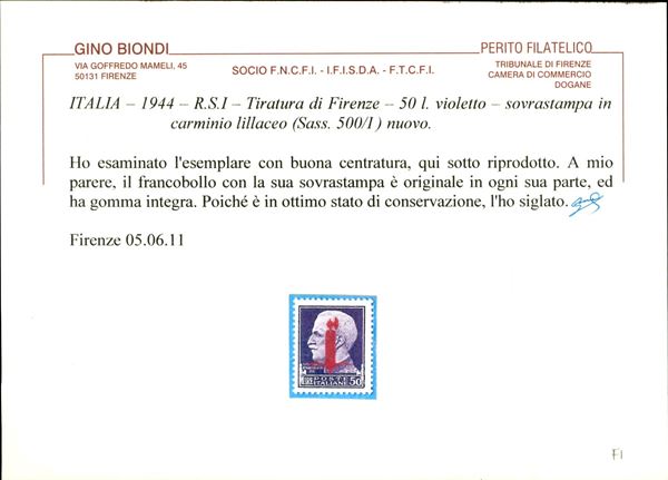 1944 - 50 lire carminio lillaceo (501/I) - tiratura di Firenze - gomma integra - Chiavarello + cert. Biondi